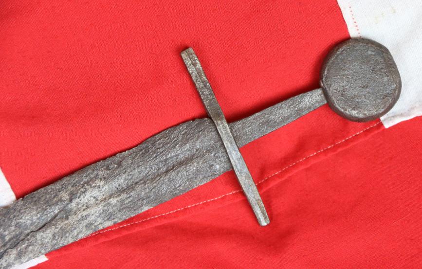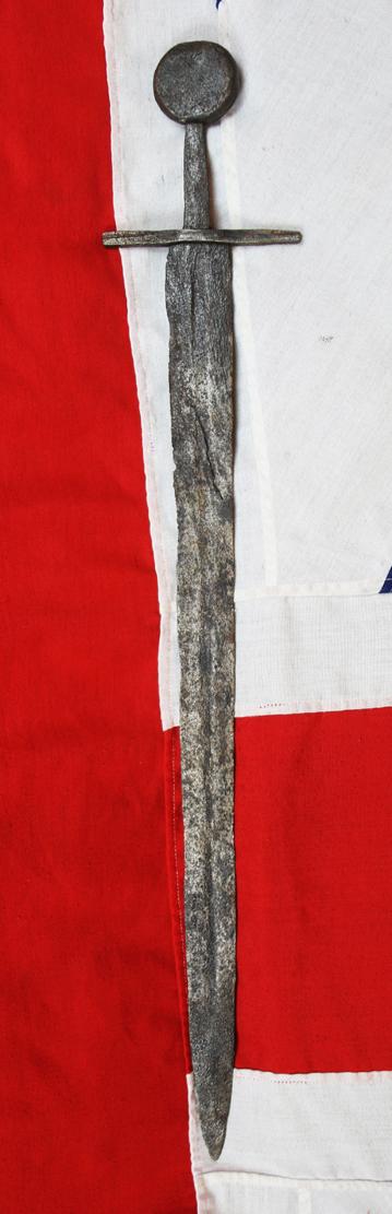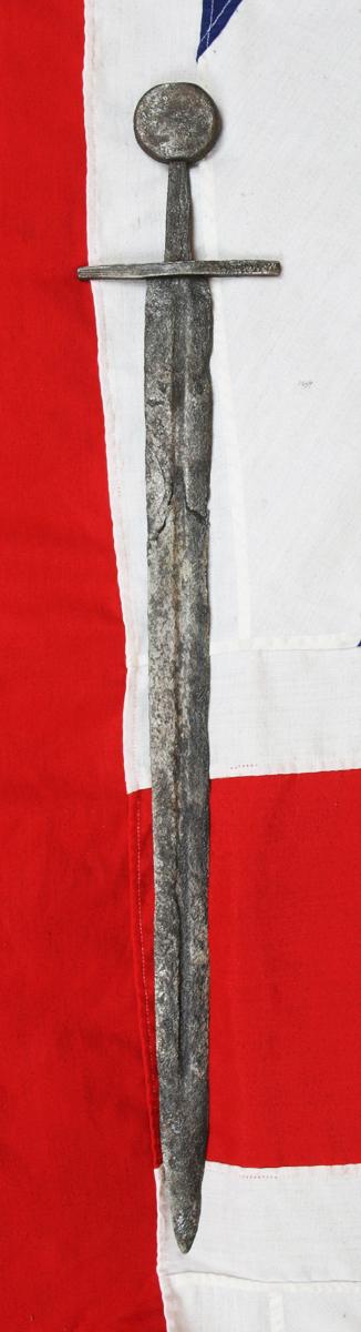A well-balanced Oakeshott Type XI sword with double-edged blade, shallow fuller and solid tip; straight lower guard, medium tang and disc pommel of type G. 1.1 kg, 88.5cm (35"). Fine condition, surfaced cleaned, slight delamination at the mid section of the blade.