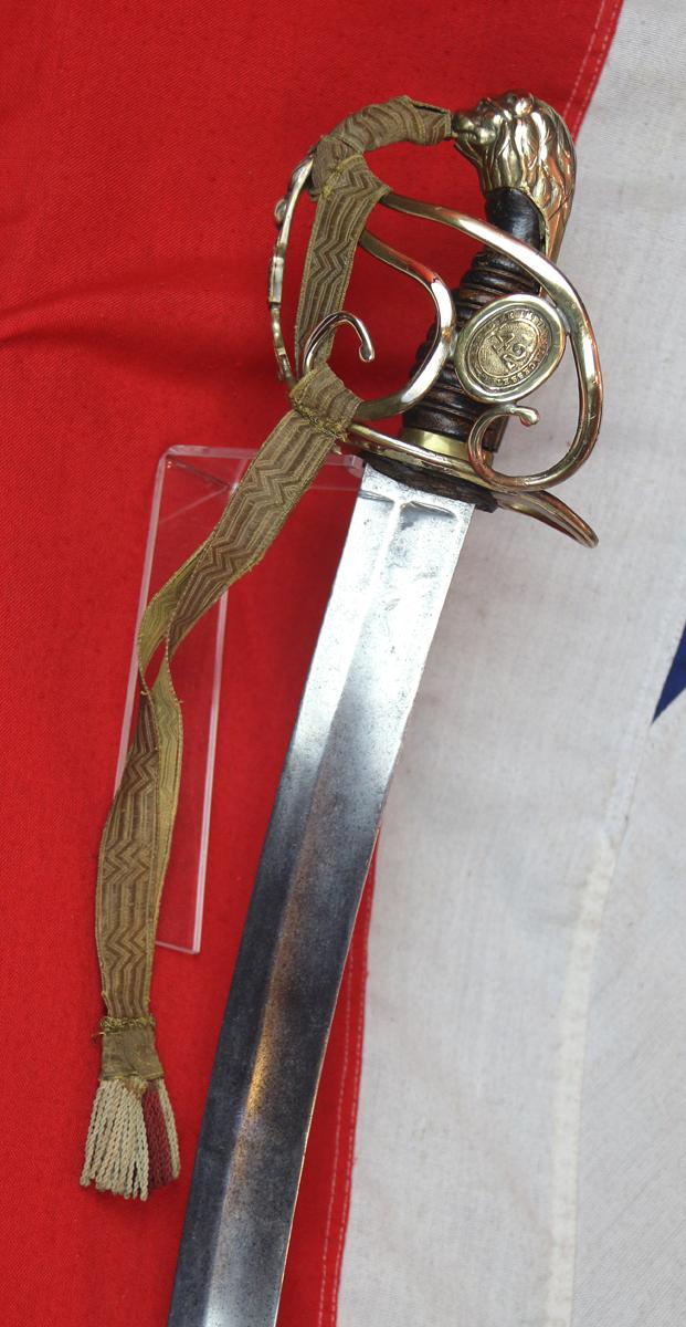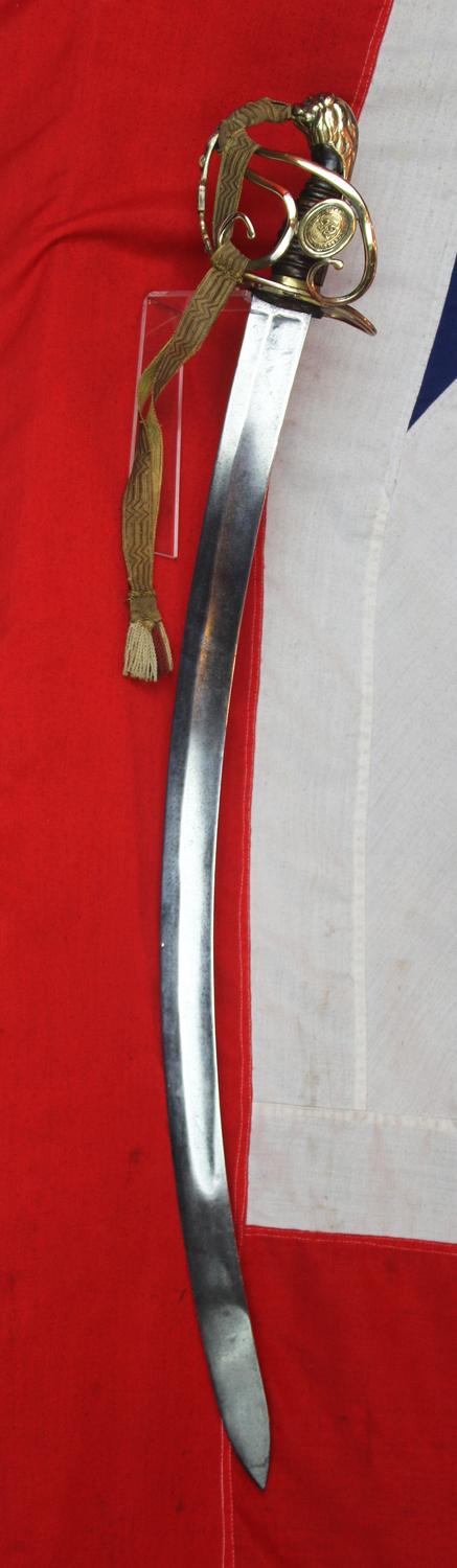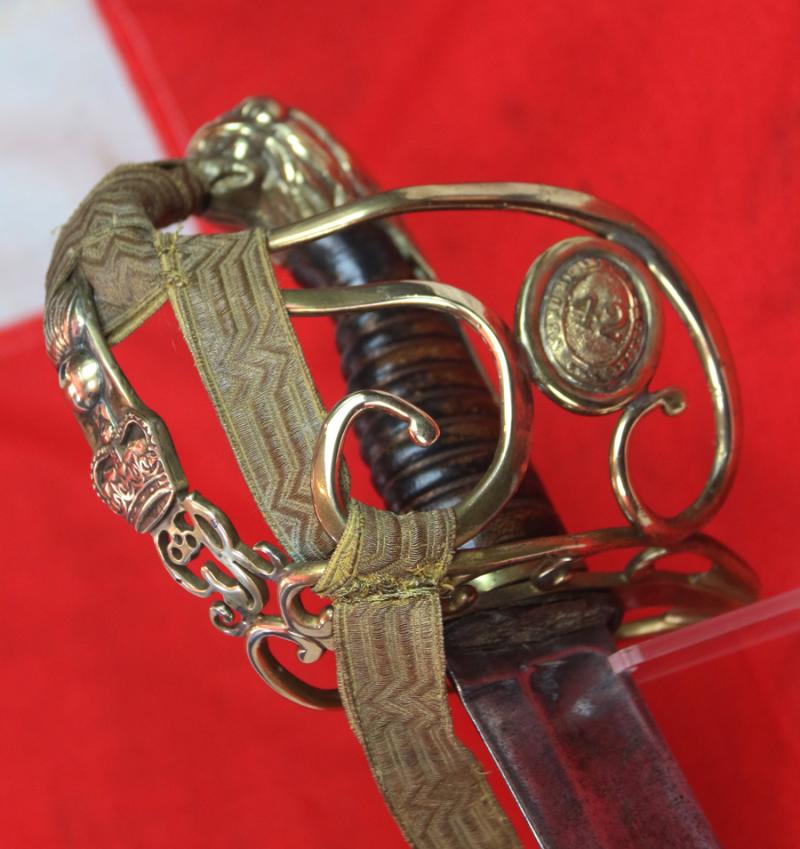 Most attractive three bar, half basket, slotted hilt, with traditional GR cypher with above a grenade company officer's badge, with regimental ovoid insert of the Black Watch regt. A beautiful bespoke officer's sword, blade stamped by the maker's, Wooley & Deakin, the company name of the partnership in Birmingham from 1800 to 1804. It changed to add an additional partner in 1808. Triple wire bound grip in very good and complete condition.