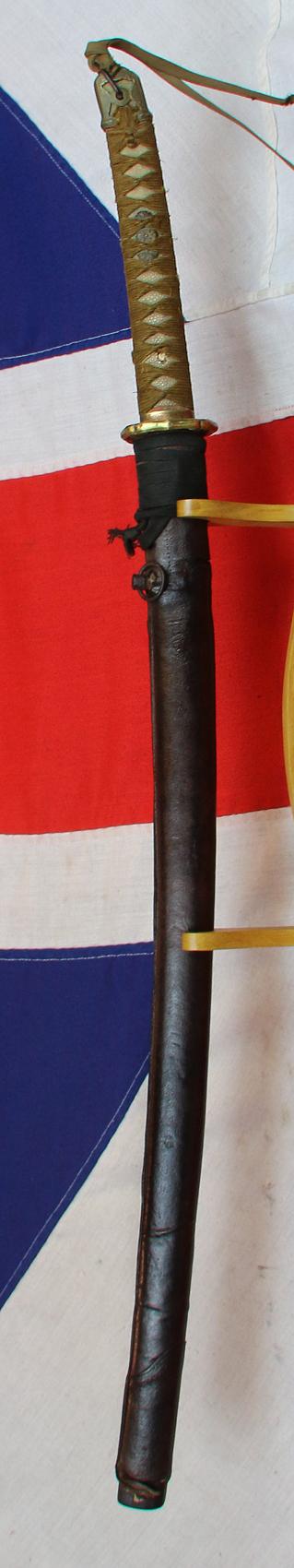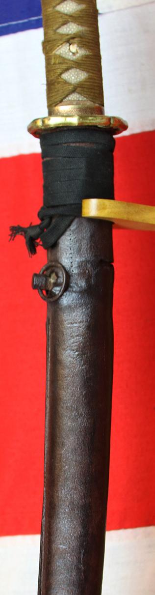 Traditional officer's fittings, with an all brown officer's portopee sword knot, for an officer of the Imperial Japanese Army, with traditional combat leather covered wooden saya, with black sageo bound top section.