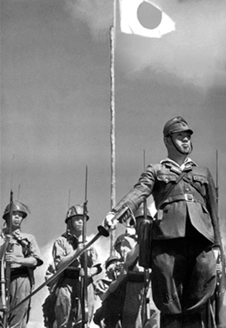 Three photos in the gallery of traditional Japanese military swordsmiths and a blade polisher creating their swords for officers in their workshops in the 1930's. and a Japanese officer with his sword in front of his men, and the flag prominant, on parade