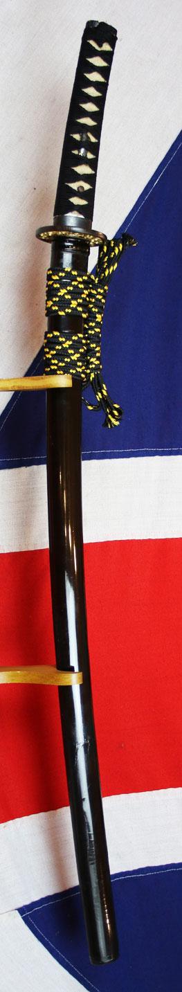 It is mounted with an old circular Awari iron sukashi tsuba, with gold onlaid within its design, and an original Edo black urushi lacquered saya.