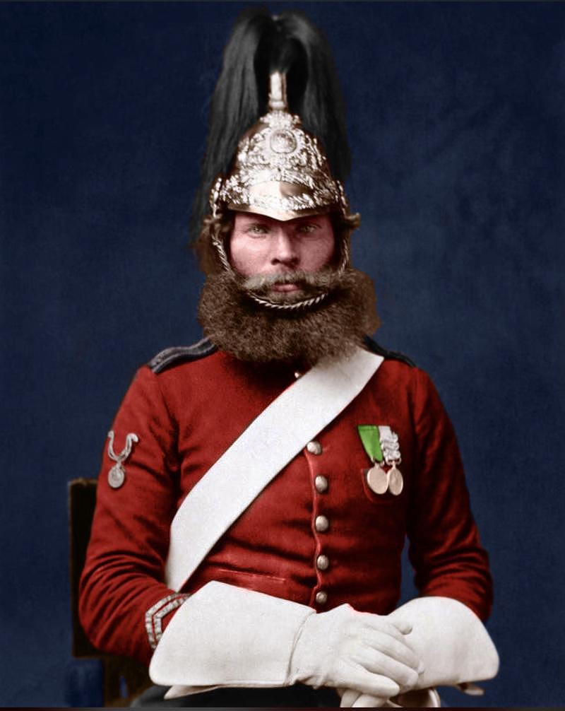 Photo in the gallery taken in the 1860’s of a Heavy Cavalry veteran wearing his very same form of helmet with its black plume {recoloured}