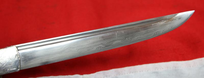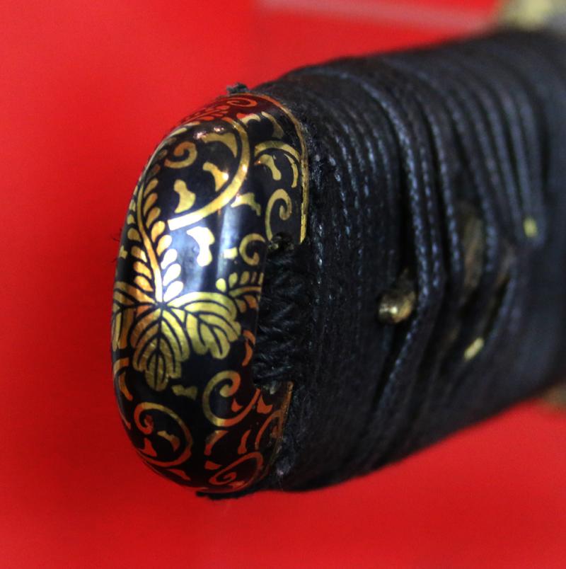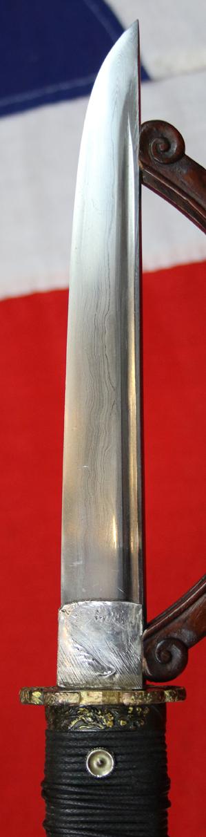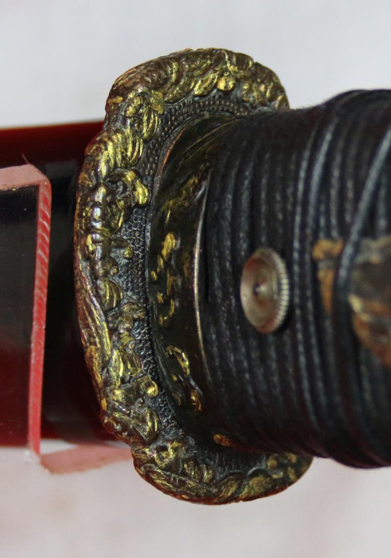 With cord bound hilt, over patinated copper metal figural mounts, gold inlaid pommel in a aoi leaf and vine patterning, gilt highlighted nicely chiselled iron sword guard, silver foil covered blade collar and single edged damascened blade.The whole design is very much in the Japanese taste, but with a Chinese form fixed hilt, unlike the Japanese dagger hilt which is removable. Black lacquer scabbard.
