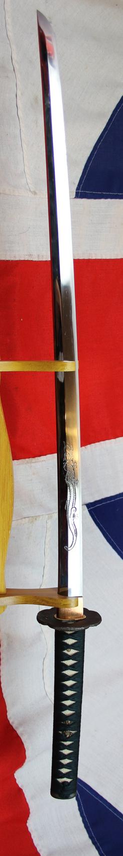 A Stunning, Antique, Edo Period Circa 1660 'Dragon Horimono' Shinto Horseman's Katana. With A Carved Horimono Blade of a Dragon. With a Superb Suguha Hamon That Transforms With Choji Elements At The Top Section