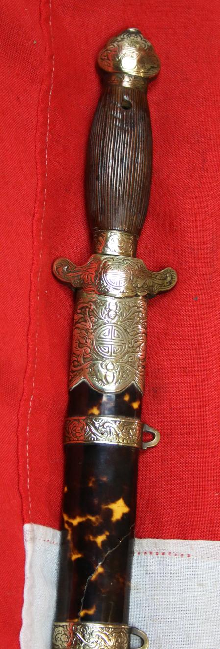 Chinese sword, which belonged to Admiral Sir James Hanway Plumbridge (1787-1863). The hilt of the sword consists of a gilt pommel and crosspiece with very short down-turned quillons, and a fluted brown grip. The hilt is ornamented with a design of bats, which are a symbol of good luck. The steel blade is straight and double-edged. The point of the blade has evidently been broken off; it is about an inch too short for the scabbard and is rather roughly ground. The wooden scabbard is covered with lacquered paper actually tortoishell, and has four gilt lockets and a chape, which is ornamented with a design of bats. The two middle lockets are fitted with loops. This sword was offered to the National Maritime Museum as the sword which was worn by Admiral Sir James Hanway Plumbridge when he was a Midshipman at Trafalgar. It is inconceivable that he wore a Chinese weapon at Trafalgar. He probably obtained the sword during one of his three commissions in the East Indies. Admiral Sir James Hanway Plumbridge (1787-1863) entered the Royal Navy on the 6th September 1799 and was a Midshipman in HMS 'Leda' in the expedition to Egypt in 1801. At Trafalgar he was acting 6th Lieutenant in HMS 'Defence', and on the 20th August 1806 he was confirmed in rank. See photos 9 and 10 in the gallery, it shows the admiral's identical Jian sword on display in the National Maritime Museum, the photos are sadly poor quality