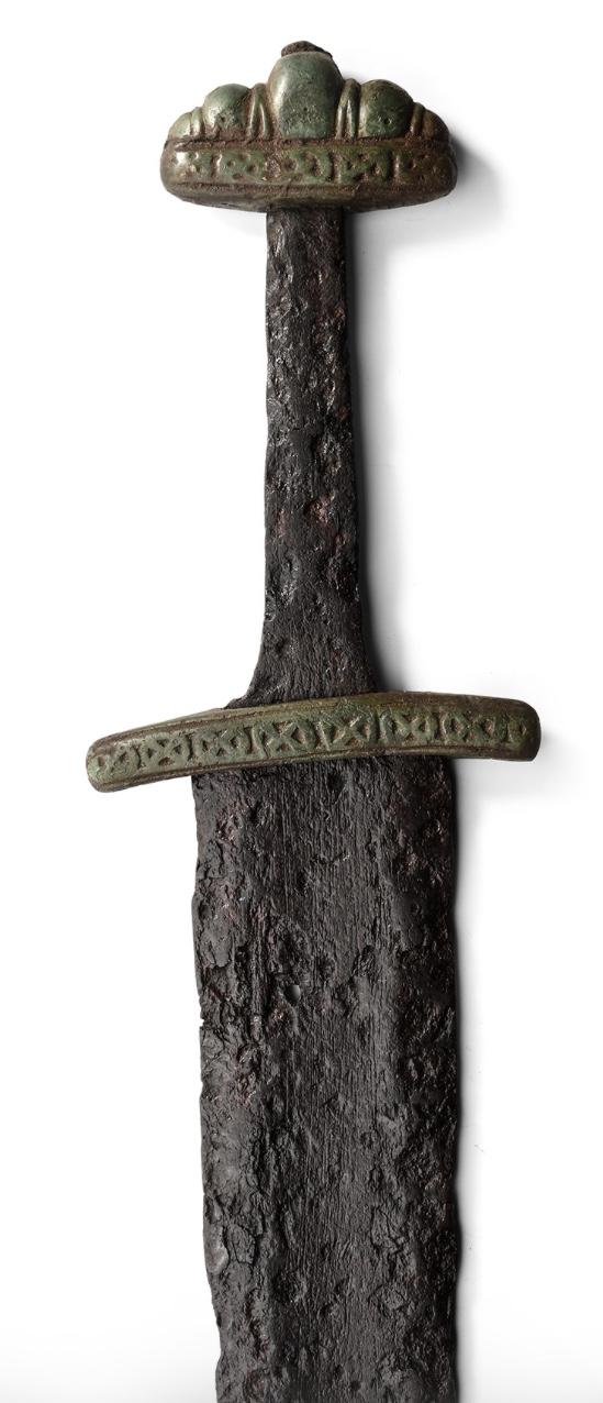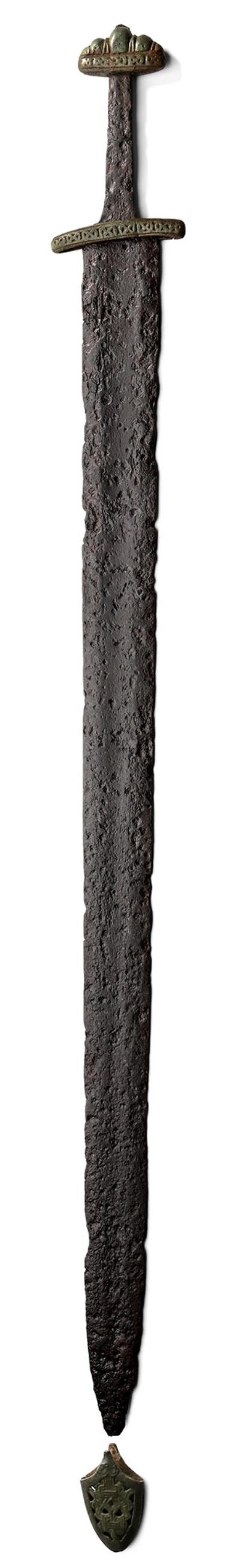 Magnificent Original Viking Age Broadsword With 'Hemse, Gotland' Bronze Hilt Mounts & Beautiful 'Sun Wheel' Sólarhvél. Jelling Decor. 800-1000 Years Old. Pattern Welded Blade, With Bronze Jelling Decorated Scabbard Chape, Viking Helmet & Head Design