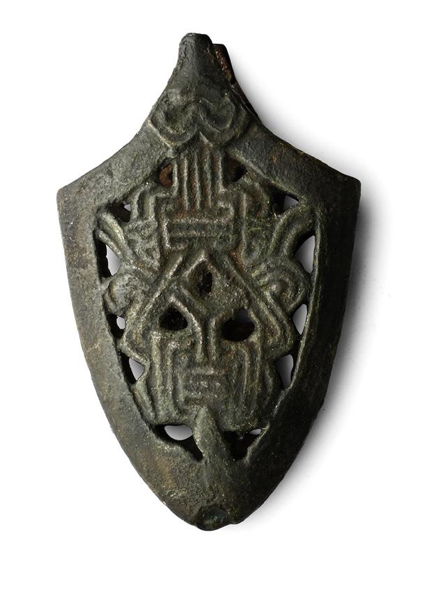 There are two very similar, bronze, sun-wheel Jelling decorated Viking age sword hilts in the Gotland Museum in Sweden. See photo 4 for reference. The stunning jelling bronze scabbard chape, that clearly shows in its intricately pierced design, a Viking nasal bar helmet worn upon the Viking warrior’s head, with his bared teeth, goatee beard, and surrounded by Viking knotwork decoration, is now all that remains of its former leather scabbard that obviously rotted away over the past millennia.