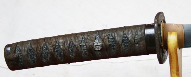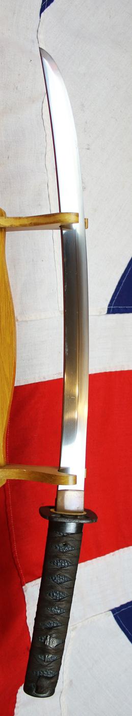 Signed Ujitsugu, fine suguha hamon, bound tsuka with plain iron fuchi-kashira, floral menuki, iron sukashi tsuba, in its warm brown urushi lacquer lacquered saya circa 1670