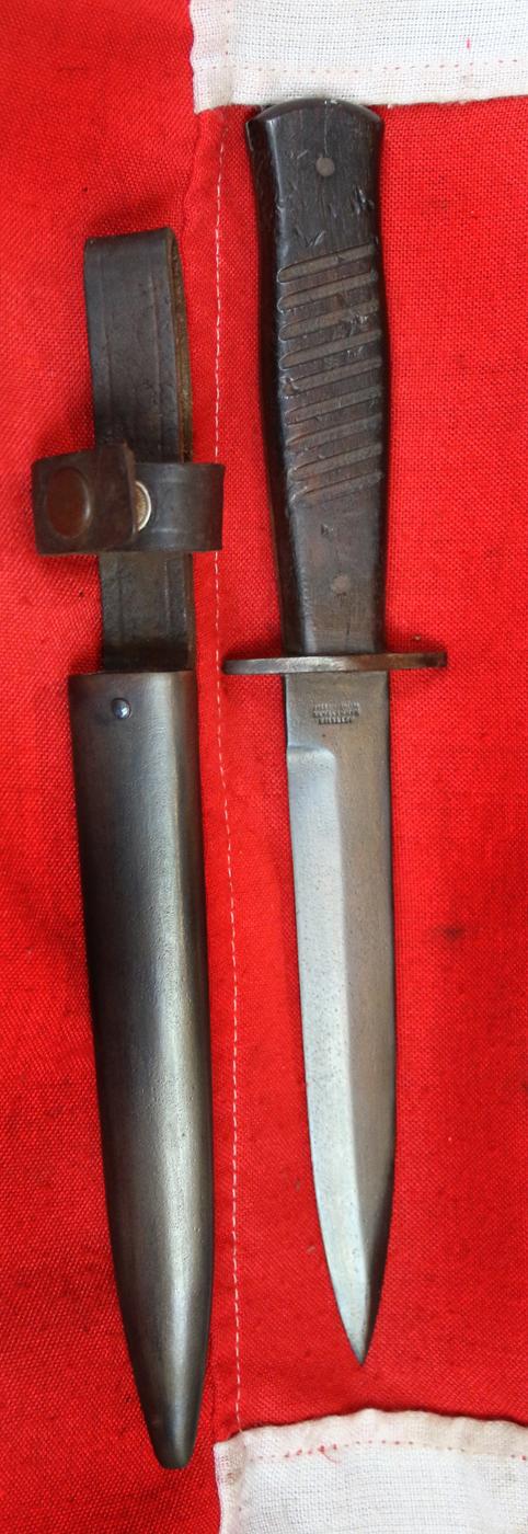 The hilt is fitted with ribbed {9 ribs} wooden grips, secured by steel rivets, with a steel crossguard. slightly rounded flat steel scabbard with rivietted leather belt frog and retaining button to the small grip strap. Single edged blackened steel blade with small return false edge at the tip. Maker marked and with imperial proof stamp.