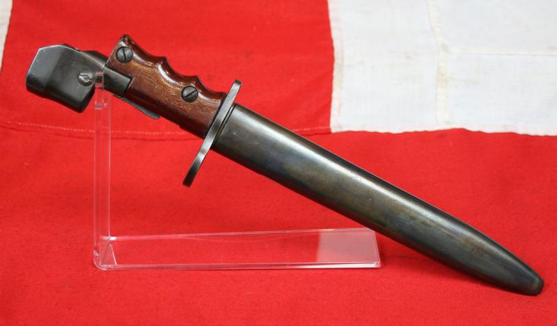 As can be imagined with relatively low numbers, this is a comparatively rare bayonet when compared with the wartime spike bayonet. The bayonet was issued with the standard scabbard also used on the No5 and No9 bayonets: