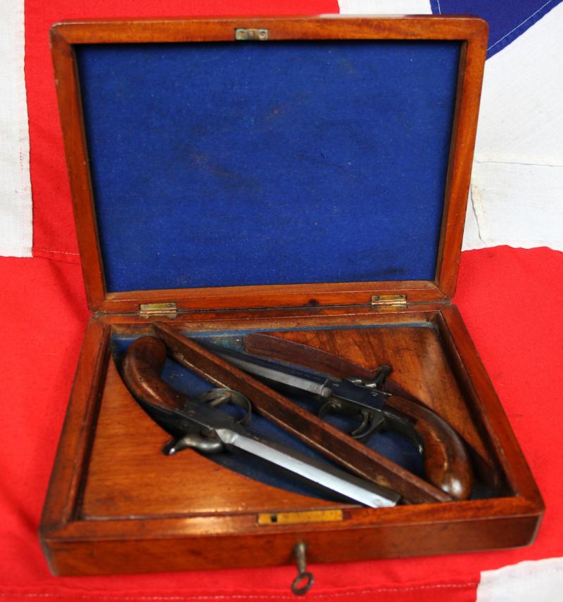 Box case 8 inches x 10 1/5 inches x 2 inches, pistols, overall 8 1/2 inches each, barrel's 4 inches each.