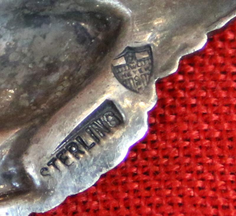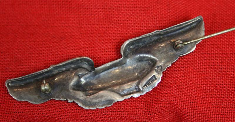 The wings measure just over 3” across and are made of a single struck design. Most of the original plating has been retained and the artwork is still very easily recognizable. The back is “hollow” and the N. S. Meyer "Shield" hallmark and STERLING can be found on the right wing {looking from the back}.
