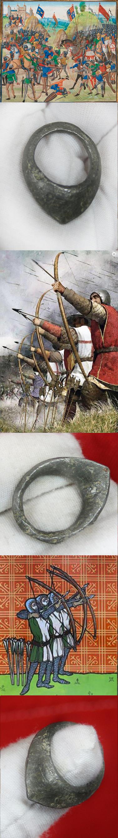 Typically a flat area extends from the ring to protect the pad of the thumb from the bowstring; this may be supplemented by a leather extension. An absolute iconic original piece of British history. In superb battlefield recovered patinated condition, and very nice indeed. Beautiful Items such as this were oft acquired in the 18th and early 19th century by British noblemen and women touring battle sites in Northern France and Italy, in fact most of Europe and the Middle East, on their so-called ‘Grand Tour’. They were often placed on display upon their return home, within the family’s 'cabinet of curiosities', within their country house. Some significant British stately homes had entire galleries displaying the treasures and artefacts gathered and purchased on such tours, and some tours lasted many years, and the accumulated souvenirs numbered in their hundreds or even thousands. A popular pastime in the 18th and 19th century, comprised of English ladies and gentlemen traveling for many months, or even years, throughout classical Europe, and the Middle East, acquiring knowledge and education on the arts, and thus returning with antiquities and antiques as souvenirs for their private collections, and these travels have been thus called ‘Grand Tours’. We recently acquired some beautiful pieces acquired from the descendant family of the 10th Duke of Hamilton in the 1820's such as the archer's ring from just north of the Mave River at Crecy.