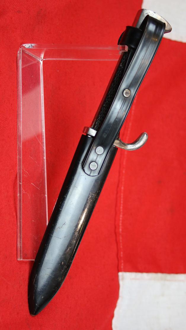 The dagger is jolly nice but has seen wear and use, the blade is bright polish but traces of light surface pitting and polishing has worn away a lot of the etching. The grips are good and the diamond enamel swastika has one small chip.