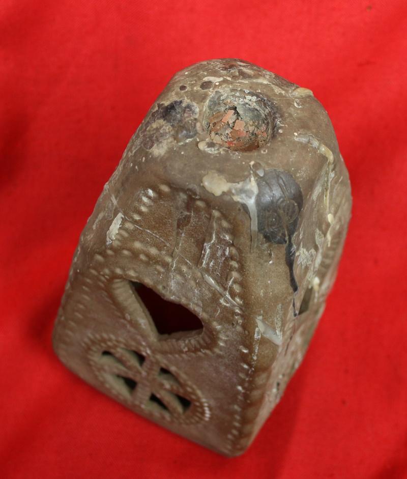 In brown ceramic with incised decoration of runic symbols, designed to hold the Winter Solstice candle, and it bears the large SS Allach factory stamp into one of its four feet. Their are numerous wax traces of original use, in several shades of white and dark brown