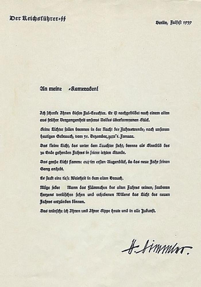 In a 1936 memorandum, Heinrich Himmler set forth a list of approved holidays, in part supposedly based on "pagan" traditions, including a "Julfest" intended to replace Christian rites. The Julleuchter and other symbols were also meant to serve as a consolation to women who, by having married into the SS, had to renounce the spiritual shelter and service of their church. The SS officer was instructed to set up a shrine that included, an awarded by Himmler, ceramic Julleuchter in the corner of one room of his household.