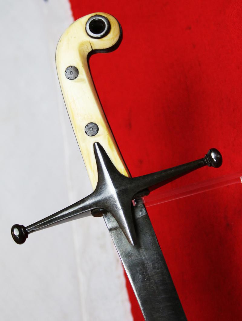 All the steel mounts are very good, the hilt ivory is also good with a small north south crack at the pommel area. The leather is good and with a thumb print size bruise to the surface around 2/3rd the way down the scabbard. No scabbard seam stitching present at the reverse side.