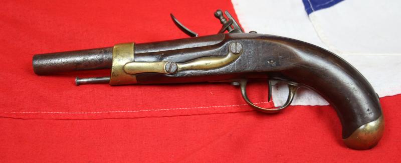 This flintlock pistol was made at the French Imperial Arsenal at St Etienne in 1811, during the time of Napoleon's Grande Armee during the Peninsular Campaign, before the Grande Armee's invasion of Russia, and three years before Napoleon's defeat in 1814 and exile to Elba, and later, after his return in 1815. Thus this pistol was made, and issued to the cuirassiers, that then years later transferred their loyalty to the King, then back once more back to their old emperor, Napoleon, upon his return from exile in Elba.