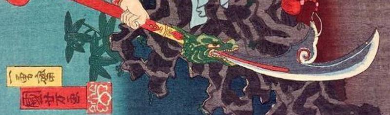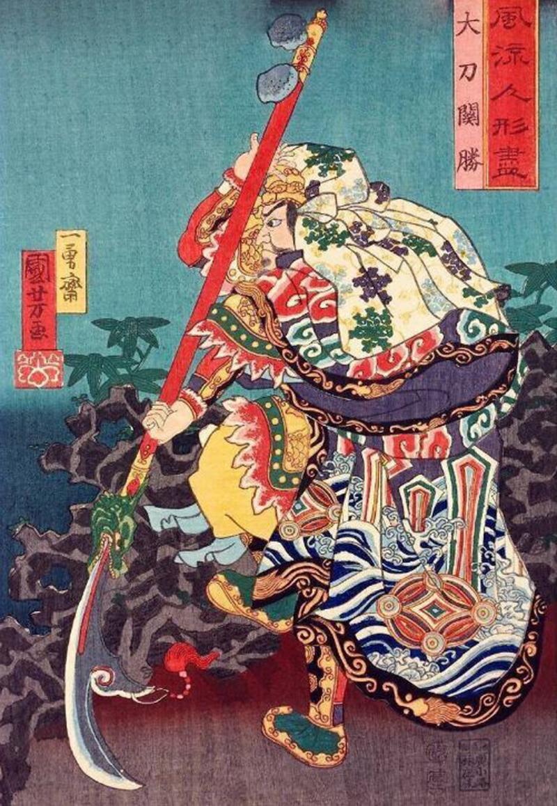 Famous prints, that we we show in the gallery, depicts the battle of Tōshōfu (Dongchang fu) where Kanshō is blocking the stones that are being thrown by Botsu-usen Chōsei (Zhang Qing), using the butt of his enormous glaive to parry them. He was considered particularly brave to fight against Chōsei who was famous for being able to hit his target with a stone ten times out of ten.