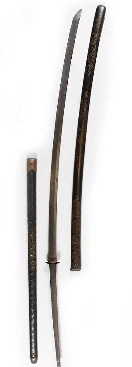 We have also acquired the collector's prized nagamaki great sword, almost six feet long in its koshirae. The type of samurai sword you very, very rarely see in Europe today outside of a museum, and often not in most museums either. This is one of the rarest types, an example that escaped the Shogun's *edict to cut the nagamakis and no-dachis down to regular katana sword length, as he believed swords that were over length should be shortened. {see details below}