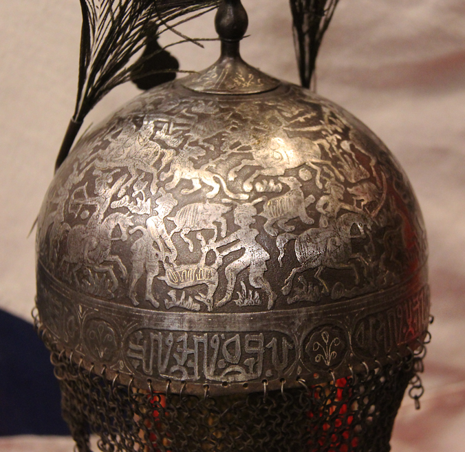 The helmet has a hemi-spherical skull engraved throughout, the skull fitted at its apex with a high spike, a pair of plume-holders at the front and with a staple for a sliding nasal guard, decorated over the greater part of its surface with traces of gold koftgari of scenes of a hunt, and a band of koranic Islamic text, and mail neck-defence of butted links. Khula Khud helmets of this design originated in Central Asia, and this form were worn by Persian Empire soldiers in the 18th and 19th Centuries.