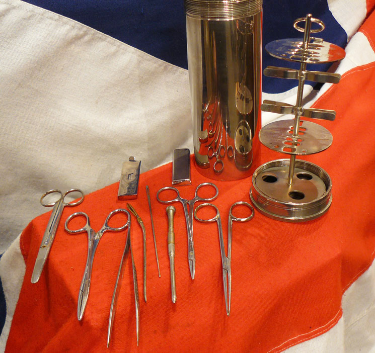 With numerous tools, scissors clamps etc., and cases for needles and blades, for principally bullet and shrapnel extractions. One instrument lacking. Superbly engineered, and a beautiful quality piece.