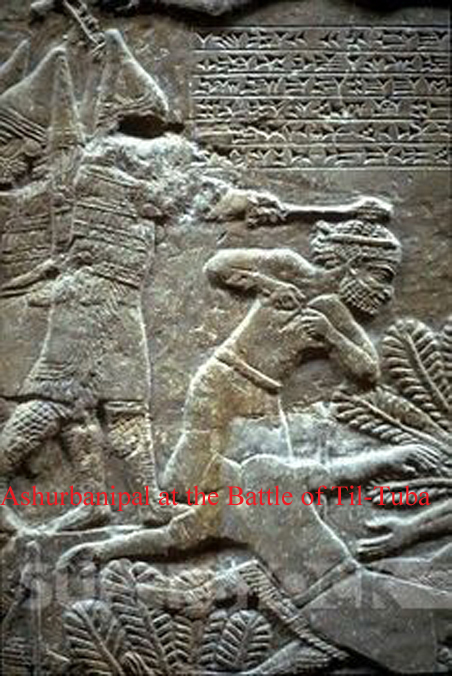 The Shardanas or warriors from Sardinia who fought for Ramses II against the Hittities were armed with maces consisting of wooden sticks with bronze heads. Many bronze statuettes of the times show Sardinian warriors carrying swords, bows and original maces. Persians used a variety of maces and fielded large numbers of heavily armoured and armed cavalry (see cataphracts). For a heavily armed Persian knight, a mace was as effective as a sword or battle axe. In fact, Shahnameh has many references to heavily armoured knights facing each other using maces, axes, and swords. The enchanted talking mace Sharur made its first appearance in Sumerian/Akkadian mythology during the epic of Ninurta. Roman though auxiliaries from Syria Palestina were armed with clubs and maces at the battles of Immae and Emesa in 272 AD. They proved highly effective against the heavily armoured horsemen of Palmyra. Photos in the gallery of original carvings from antiquity in the British Museum etc.; Ashurbanipal at the Battle of Til-Tuba, Assyrian Art / British Museum, London/ 650-620 BC/ Limestone,, An Assyrian soldier waving a mace escorts four prisoners, who carry their possessions in sacks over their shoulders. Their clothes and their turbans, rising to a slight point which flops backwards, are typical of the area; people from the Biblical kingdom of Israel, shown on other sculptures, wear the same dress, on a gypsum wall panel relief, South West Palace, Nimrud, Kalhu Iraq, neo-assyrian, 730BC-727BC.