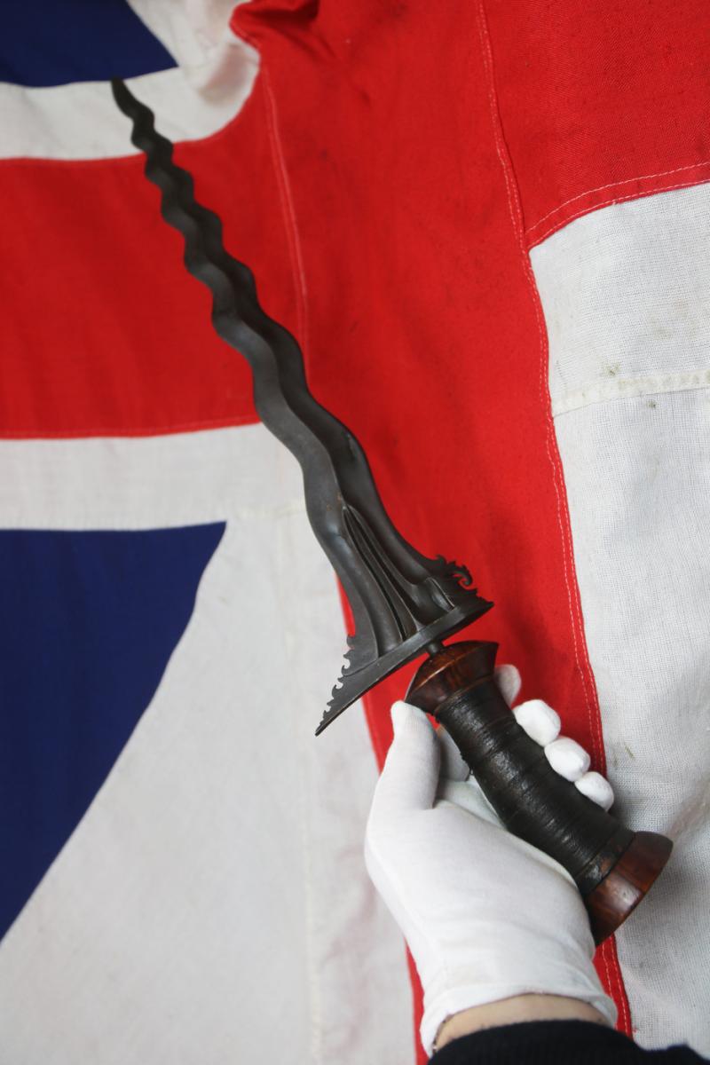 The kris or keris is a distinctive, asymmetrical dagger from Indonesia. Both weapon and spiritual object, the kris is considered to possess magical powers. The earliest known kris go back to the tenth century and most probably spread from the island of Java throughout South-East Asia.