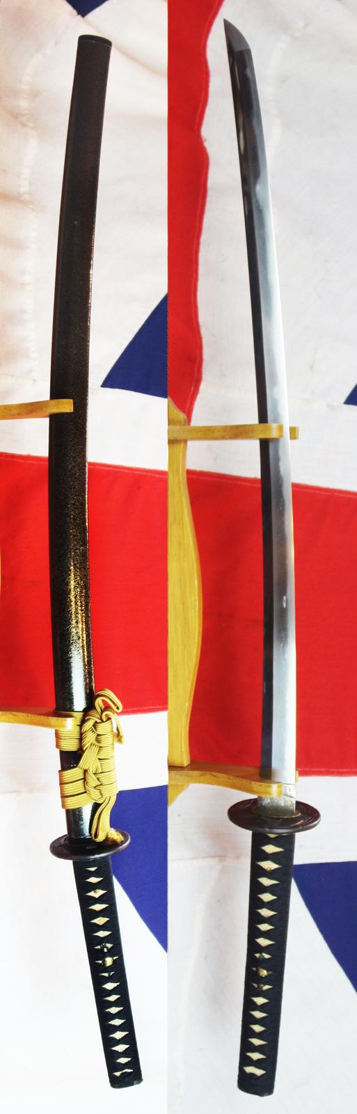 Fine Edo saya in superb condition decorated under clear urushi lacquer with pine needles and entwined silver wire. Very good Edo tsuba of iron {tettsu} with mokume wood grain body and a bamboo mimi {rim} with bamboo leaves. Wonderful quality shibuishi fuchi -kashira of takebori dragonflies with a gold seal. Just returned from a interior decorators display in Grosvenor Sq. London.