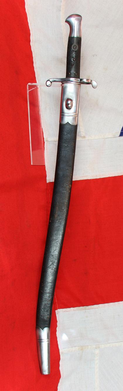 The rifle that this sword bayonet was designed for the P1853 two band Enfield rifle, and was the type used in the late Indian Mutiny at the "Seige and Relief of Lucknow". Chequered leather grip with rivets, and screw affixed retaining spring. Good, long, Yataghan blade in bright polish. Excellent leather. The regiments that used this bayonet sword took part in the Second Opium War, the Indian Mutiny and the Third Anglo-Burmese War, and tens of thousands of service issue rifles and bayonets were sold to America in the Civil war, purchased by both the North, and the South. See photos in the gallery of Union and Confederates with the Enfield rifles and their yataghan bayonets. After the Civil War thousands of Confederate purchased Enfields were sold to Japan's Tokugawa Shogunate, and used in the Boshin war and the Satsuma Rebellion.