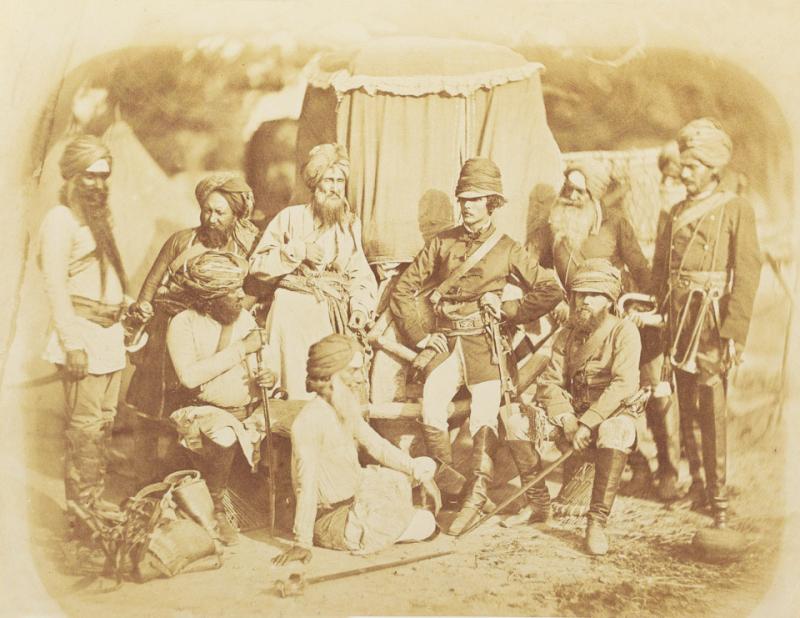 A photo in the gallery picture shows members of Hodson's Horse, a body of loyal Indian horsemen formed during the Indian Mutiny by Lieutenant William Hodson. Their distinctive uniforms included scarlet turbans and shoulder sashes over beige tunics. Beato probably took this photograph shortly after the final capture of Lucknow in March 1858. Hodson was killed during the assault. There is some confusion over the identity of the two British officers, but it seems most likely to be Lieutenant Clifford Henry Mecham (standing) and Assistant Surgeon Thomas Anderson (sitting). Anderson cared for Hodson after he was wounded and was with him when he died on 11 March 1858. 37 inch long blade