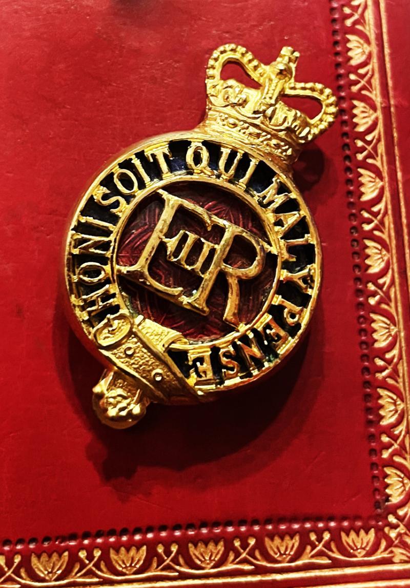 A Fabulous 1953 Pattern Original Headdress Badge For Officers of "The Life Guards", In Gilt with St. Edward's (Queen's) Crown Surmounting a Garter With Blue Enamel Over Red Enamel. Nr Mint Condition
