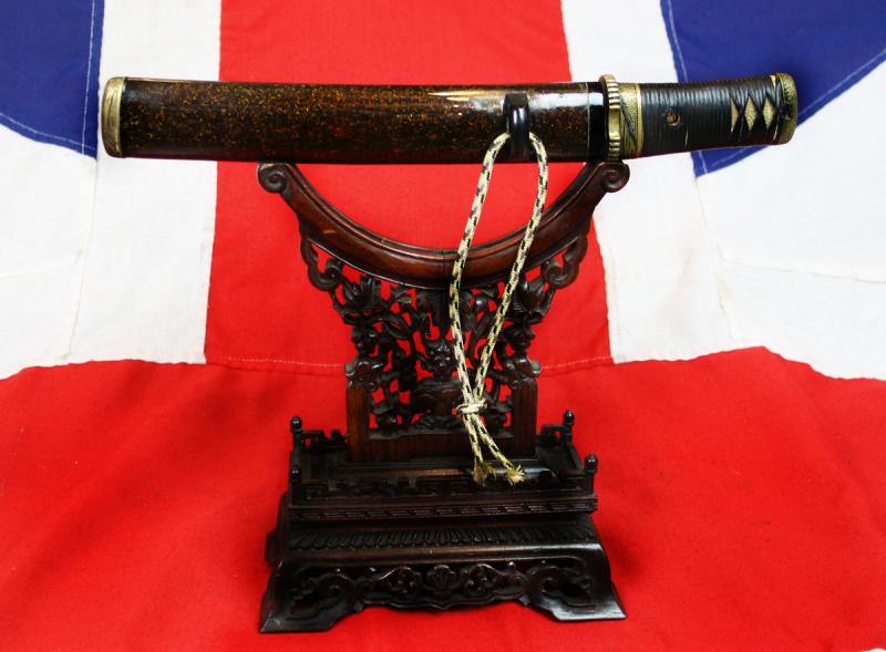 A beautiful little tanto with a fine Shinto blade of rare blade shape, in very clean polish, with just a very few minuscule age surface marks which is remarkable as it is around 400 years old. The tsuka {hilt} is very unusually bound in its original, Edo period, leather tsuka-ito in partial battle-wrap style over traditional white samegawa {giant rayskin}. The saya has stunning and intricately applied pine needle decor beneath clear lacquer and overall this early samurai dagger is incredibly appealing, and would make a fine start to a collection, or a great addition to an already existing one. The superb samurai swords that just arrived {including this one} are numbering around 25 fine pieces, from the Koto to Shinshinto period vary from tachi to katana, chisa katana, wakazashi and tanto And include, two, very fine signed ancestral bladed WW2 mounted officer's swords. One in such fine condition one could imagine it was just surrendered last week, by a Japanese colonel, not 80 years ago!