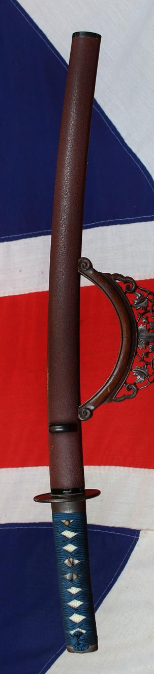 A Good Yoshii School Wakazashi, Likely Muromachi, Signed Yoshii Mitsunori Dressed With A Stunning Livery of Brown Ishime Lacquer Complimented With a Finest Blue Silk Tsukaito Hilt Wrap