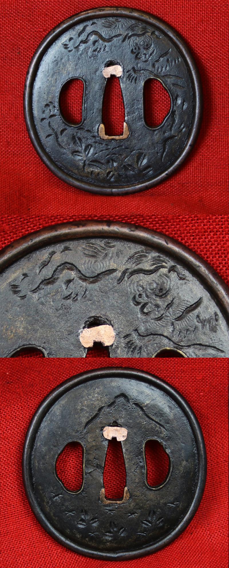 Very attractive Edo period round plate tetsu tsuba, reminiscent of the Yokoya School, with pronounced mimi rim, engraved with katakiri and kebori on one side with Mount Fuji, and a deeply engraved shishi lion dog.