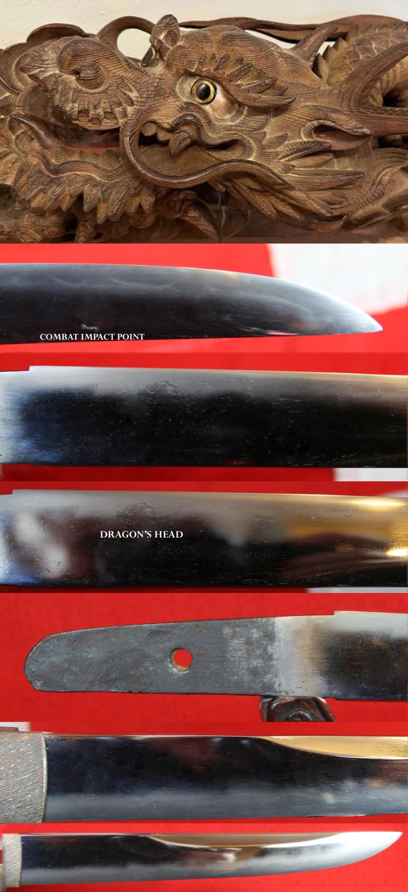 The stunning blade has a beautiful intricate hamon, including, where the yakiba meets the hada the detailed head of a dragon. A very small combat surface mark to one side of the blade, likely made by a blade tip {see both detailed in photo 10}.