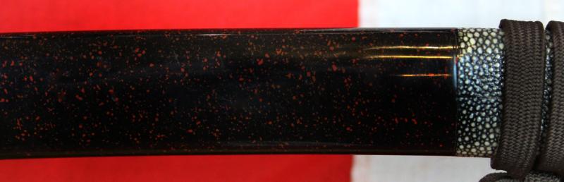 A Beautiful Signed Showa 1930's Blade, Likely Gendaito, With a Stunning Notare Midare Hamon. Traditionally Samurai Mounted Katana in Fine Polish, By Seki Yoshimitsu. Edo Period Shakudo Tsuba And Samegawa Decor Saya With Black & Red Flecked Lacquer