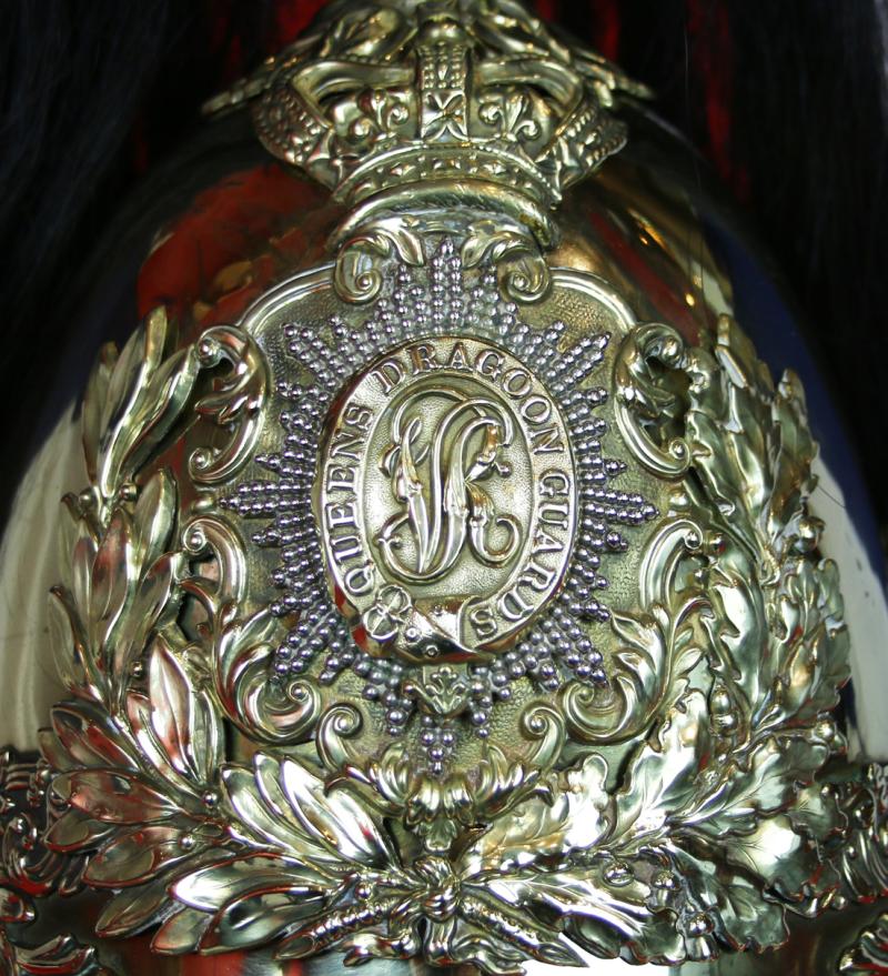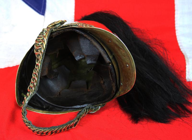 Whereas there are only a few officers helmets in existence of this vintage, other ranks' helmets are even rarer. This is a 2nd Dragoon Guards helmet with the correct black plume, and in overall good condition, the original plume has service wear.