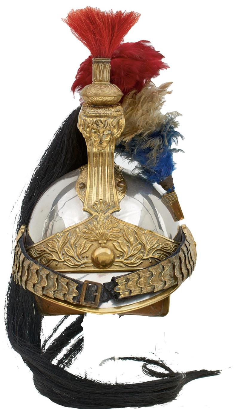 A magnificent French Cuirassiers helmet of the M1872 pattern. Designed immediately after the defeat of France at the Franco Prussian War. These were still in combat wear in August 1914 by the troops of the French Cuirassiers who were in that early period engaged in reconnaissance, guarding the flanks & covering the infantry as well as liaison & escort.