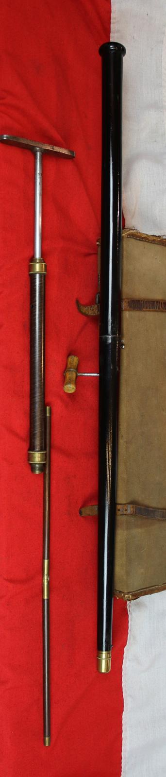 This beauty has a stunning quality Damascus steel stirrup pump with detachable T section handle in order to hand charge the top section air reservoir. The stick was then assembled to resemble an innocuous gentleman’s walking aid, complete with key, folding cleaning-ram rod, rifle insert.