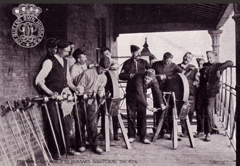 Pictures in the gallery of photographs of the regimental armourers sharpening their 1885 cavalry swords before combat.