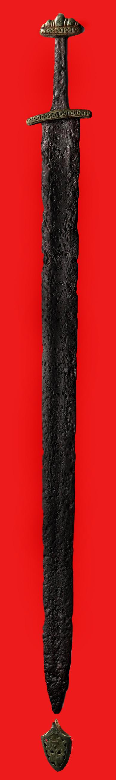 Magnificent Original Viking Age Broadsword With 'Hemse, Gotland' Bronze Hilt Mounts & Beautiful 'Sun Wheel' Sólarhvél. Jelling Decor. 800-1000 Years Old. Pattern Welded Blade, With Bronze Jelling Decorated Scabbard Chape, Viking Helmet & Head Design