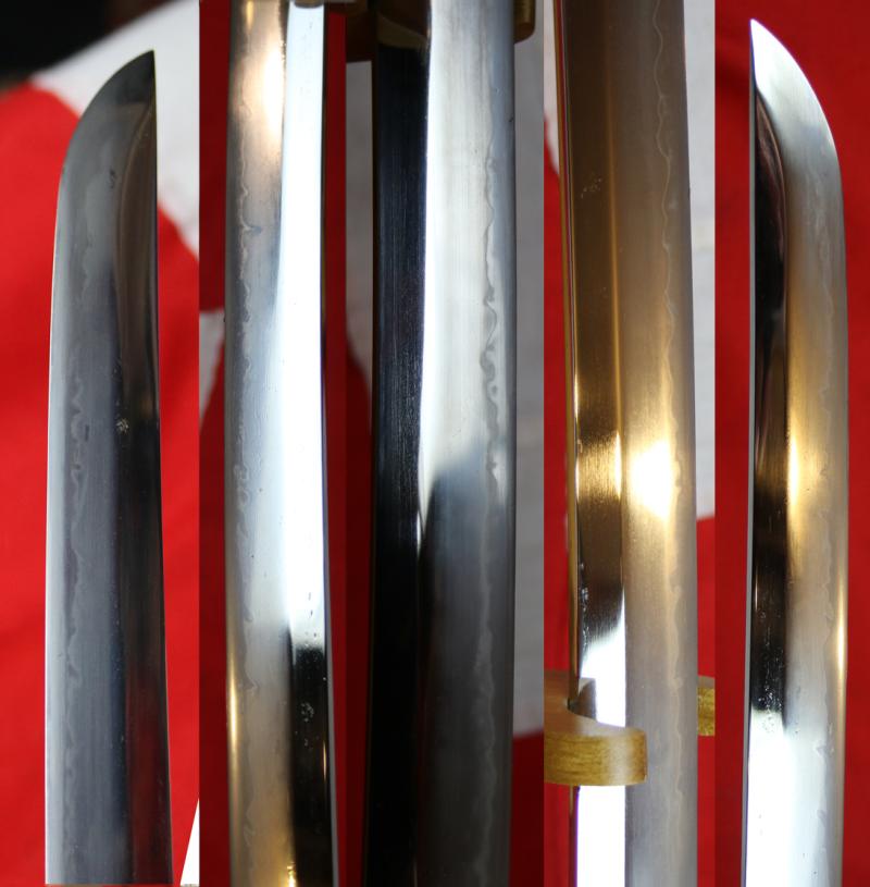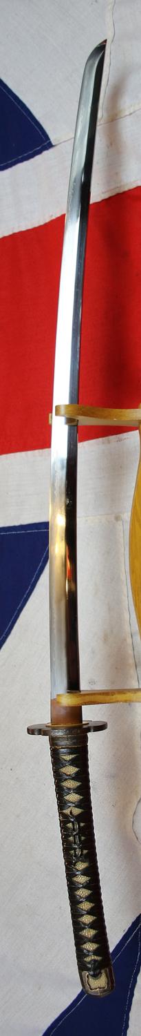 Fully leather bound tsuka-ito with iron fuchi and kabuto-gane with gilt edges, soft metal menuki in the form of a Daikyū and Ya, {war bow on one side and arrows on the other}, mokko-shaped signed iron tsuba, and the sword is set in its beautiful, original, Edo period, urushi black lacquer swirling effect, saya with traditional handachi mounts fully en-suite and matching with the tsuka. The blade has a stunning and complex gunome hamon, which in English terms, looks much akin to the surface of waves in choppy seas