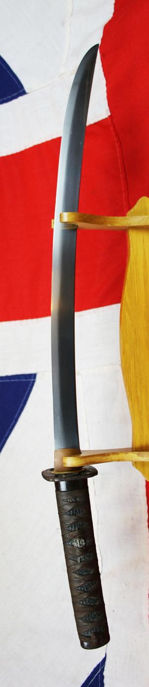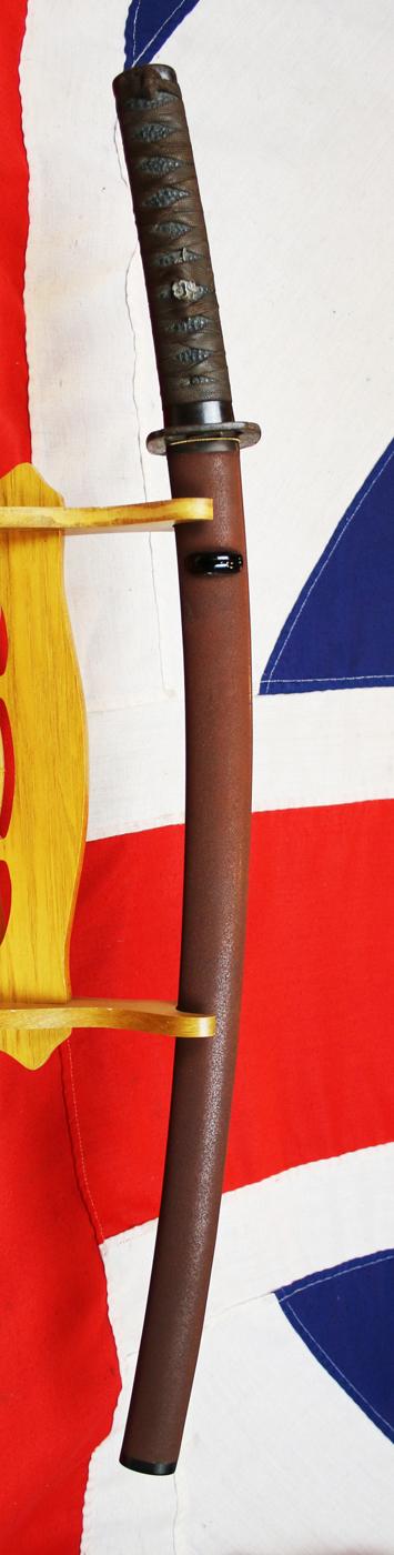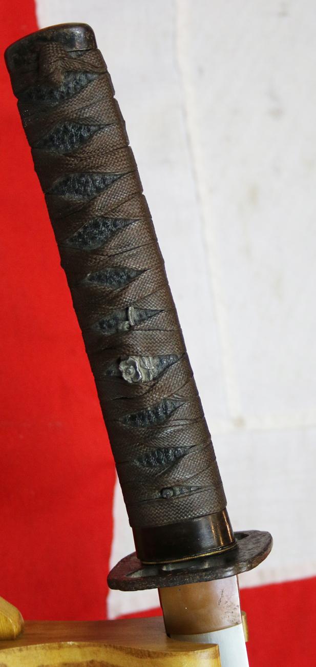 Signed Ujitsugu, fine suguha hamon, bound tsuka with plain iron fuchi-kashira, floral menuki, iron sukashi tsuba, in its warm brown urushi lacquer lacquered saya circa 1670