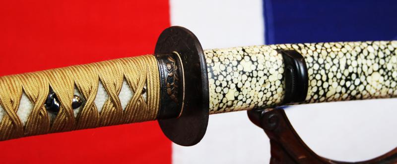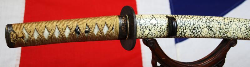 A Simply Beautiful Shinto Era, Edo Period Samurai Wakazashi Sword, Circa 1700, With A Very Fine Midare Hamon Blade, With A Fabulously Beautiful, Hand Polished, Samegawa Saya { Giant Rayskin Covered Scabbard}. And a Wonderful Hilt Bound In Golden Silk
