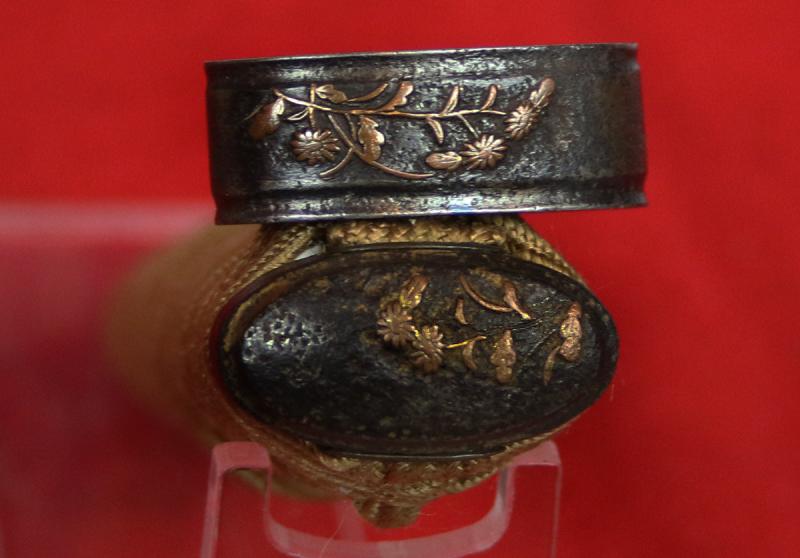 The tsuka-ito binding, is wrapped over gold and shakudo menuki {hilt ornaments}. One menuki is shakudo with pure gilt speckled overlay of fur dappling, of a resting fawn. The other is a takebori gold flower head. Both menuki are fitted traditionally over unpolished giant rayskin under the binding. The fuchi kashira {hilt collar and pommel} are Hizen school, of copper inlaid long necked chrysanthemum flower stems over a course iron surface. The habaki is a deluxe grade hand made, 'two piece habaki' overlaid in light gold.