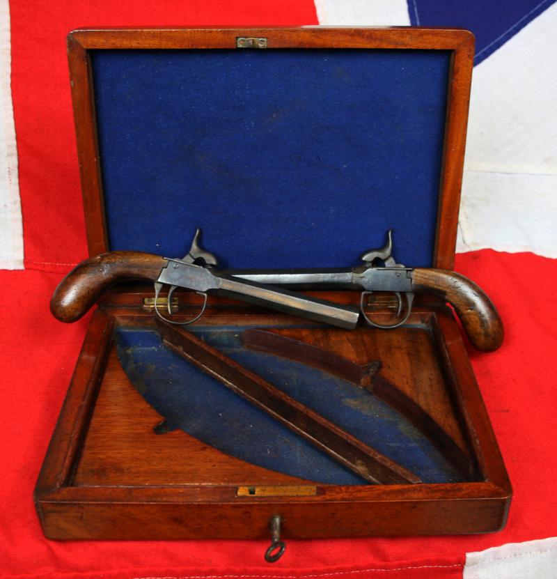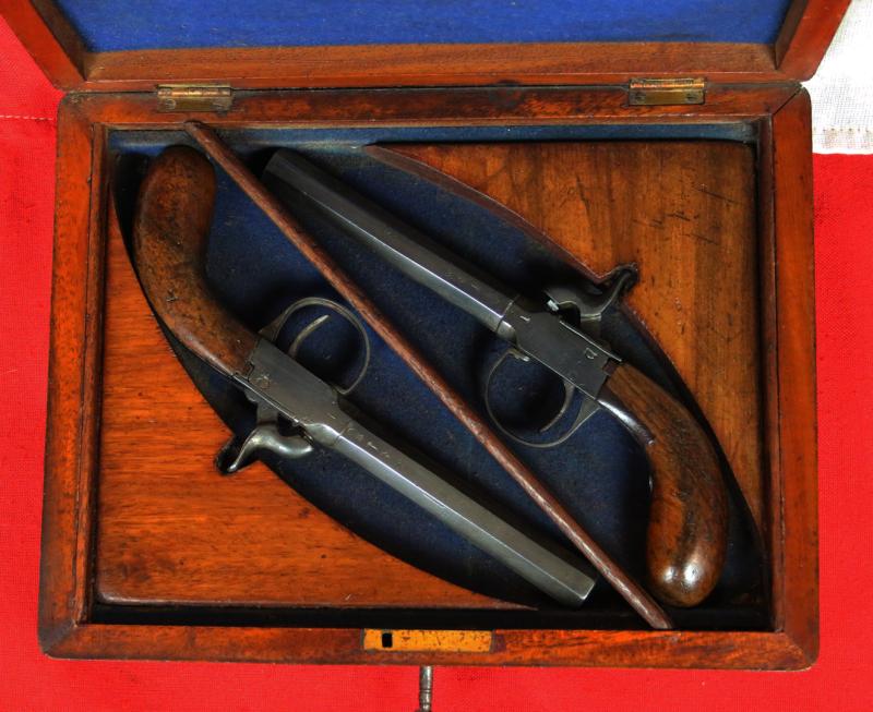 Overall blued with light natural aged russet surface beneath, both actions are tight with good springs, one action fires well on double cocking, the second just on first cocking. The walnut box is good, with some old surface scratching, key lock works well.