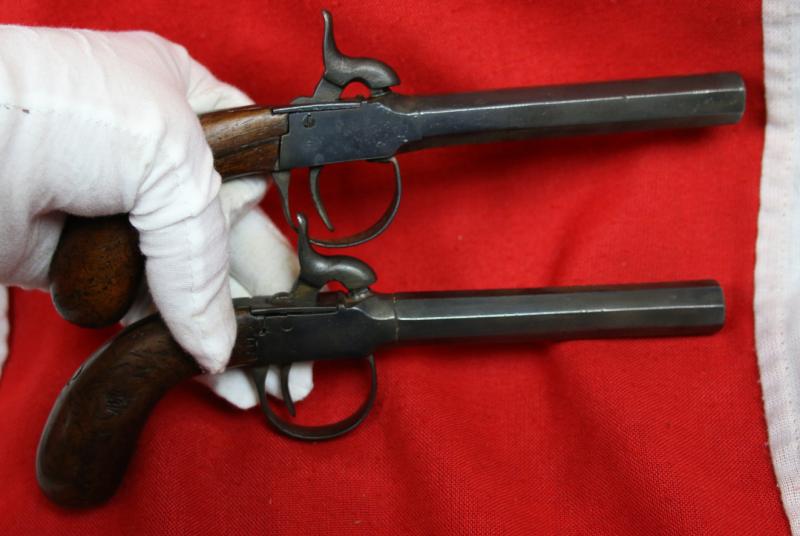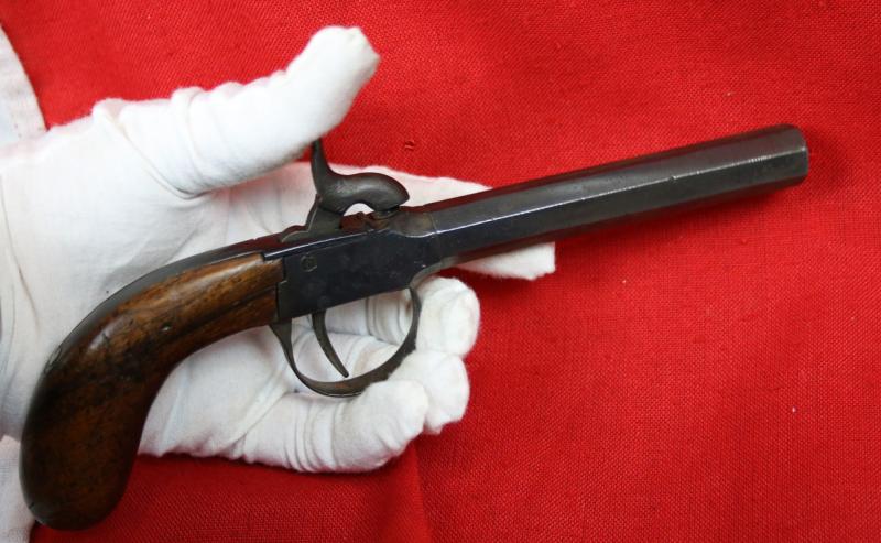 Boxlock pistols were pocket pistols popular in the late 1700s and early 1800s. Effectively the first Derringers. The most unique feature of their design was the boxlock mechanism. Unlike most firearms which have the hammer located off to the side of the pistol, a boxlock pistol had the hammer located directly on top of the pistol. They were called a boxlocks because all of the working mechanisms for the hammer and the trigger was located in a box or receiver directly below the top mounted hammer. While the hammer obstructed the aim of the user, this system had the advantage of making the gun more compact and concealable than other pistols. The first boxlock pistols were flintlock and where later made in percussion lock. Unlike modern firearms, these pistols were not mass produced, but were hand made in gunsmith's workshops.