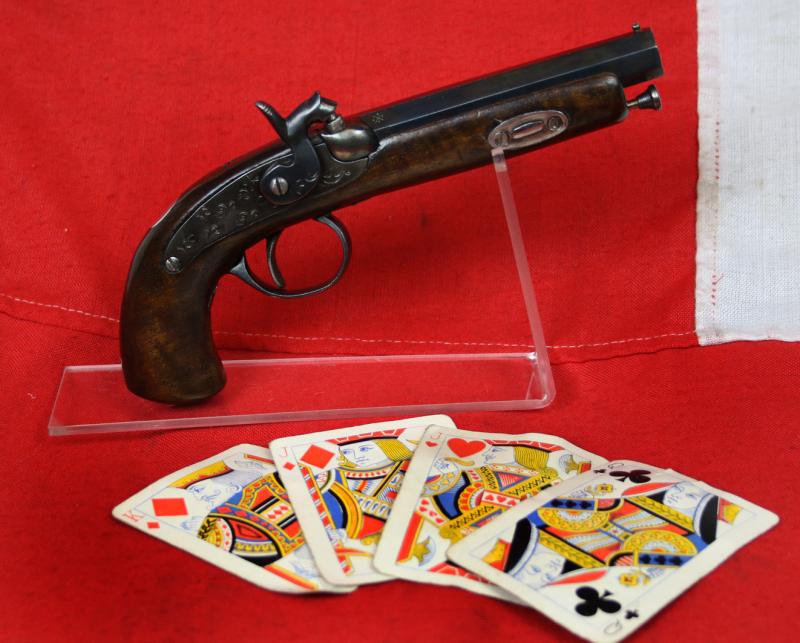This 'Derringer type of pocket pistol was actually made before the Philadelphia, US, Henry Deringer pistol, by varied makers, but the Henry Deringer pistol was made famous, by being used in the notorious assassination of President Abraham Lincoln in 1865.