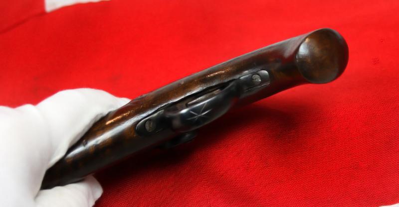 This pistol is singularly attractive. It was acquired with a pair of cased, Belgian, percussion 'Barkers' boxlock pistols. This pistol required full servicing, and hand conservation by our artisans, and after three intensive days work it has been completed and looks dramatically improved and very charming indeed. The percussion action has now been hand cleaned and conserved to be as tight and crisp as it was 185 years ago.